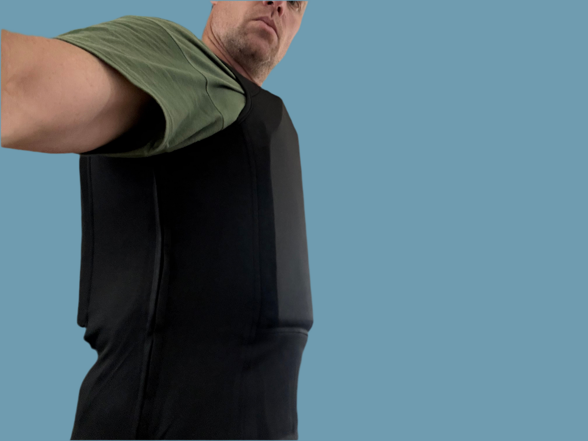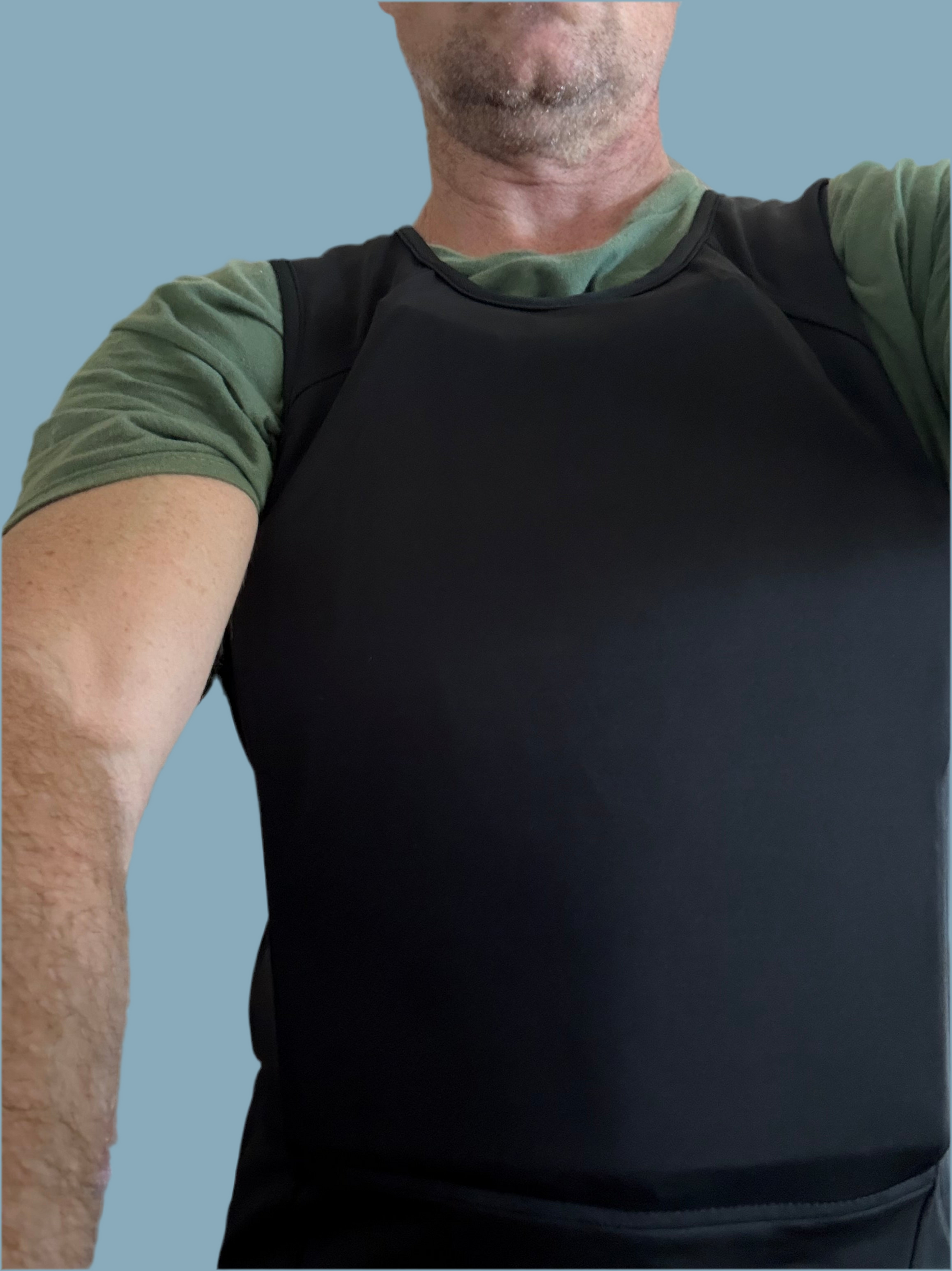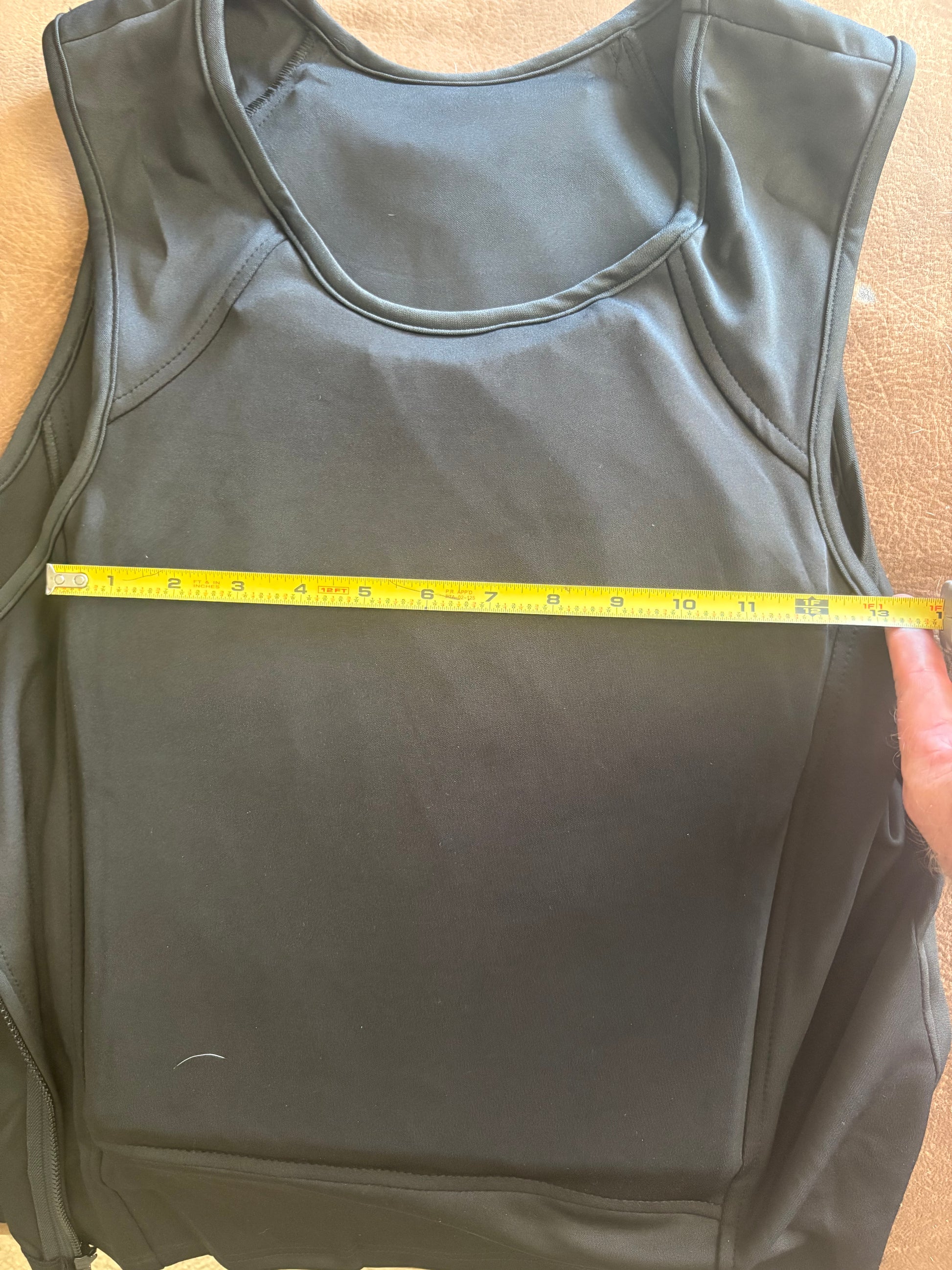 This concealed body armor zips on with a stretchy sleeveless shirt. Size fits Large -2XL, and comes with sewn in body armor level IIIA inserts. The inserts measure 14.5” long and 12” wide at the chest. Designed to be low profile protection that can be worn under a dress shirt and suit or any other type of jacket. Stops hand guns .44 mag and below